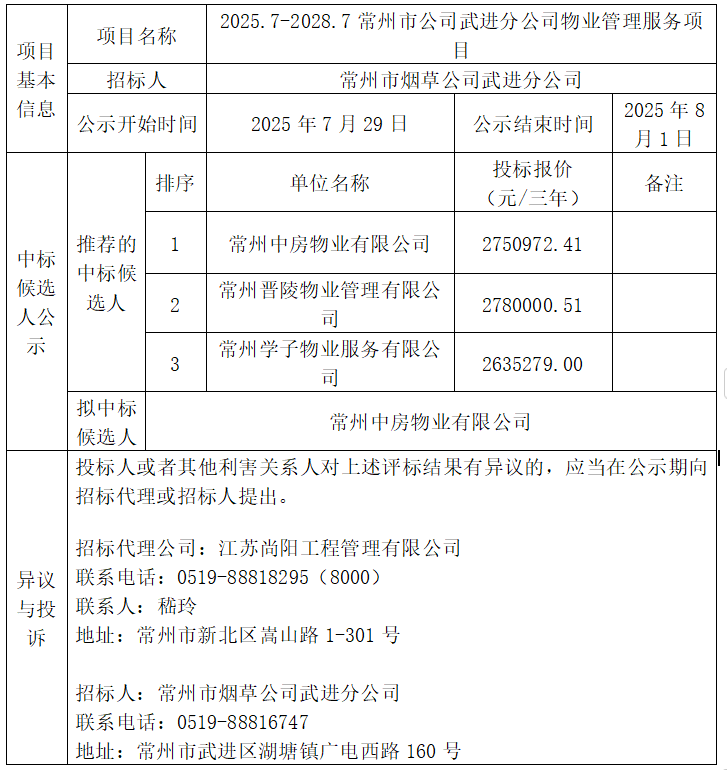 2025.7-2028.7常州市公司武進(jìn)分公司物業(yè)管理服務(wù)項(xiàng)目中標(biāo)候選人公示