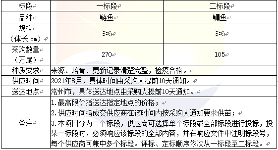 采購(gòu)需求:本項(xiàng)目是2021年第一批長(zhǎng)江增殖放流苗種項(xiàng)目,在長(zhǎng)江常州段水域開(kāi)展?jié)O業(yè)資源增殖流放工作,在長(zhǎng)江常州段放流體長(zhǎng)6cm及以上的鰱魚(yú)以及鳙魚(yú)魚(yú)種,由于采購(gòu)數(shù)量及苗種品種不同,因此本項(xiàng)目分為二個(gè)標(biāo)段,采購(gòu)清單如下: